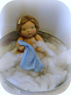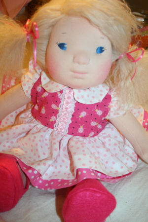 May I introduce Miss Willow. She is a sweet little baby made of cotton interlock fabric with plastic joints. She is 16 inches tall and her hair is a Tibetan lambswool wig. Her body pattern and clothing patterns are my design and her head is rolled wool as in the traditional Waldorf manner. All features are needle sculpting. She is stuffed with clean, carded wool.