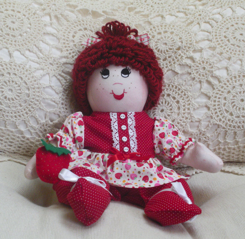 Recently I have begun creating original patterns of baby/toddler dolls. So it was an easy decision to make a baby Strawberry doll. She is 14" doll and is designed in a seated position. Her body is made from kona cloth and her face is embroidered. Her hair is made from Caron Simply soft yarn and I found the strawberry fabric online. The strawberry decoration is an original design and is made from felt and ribbon.