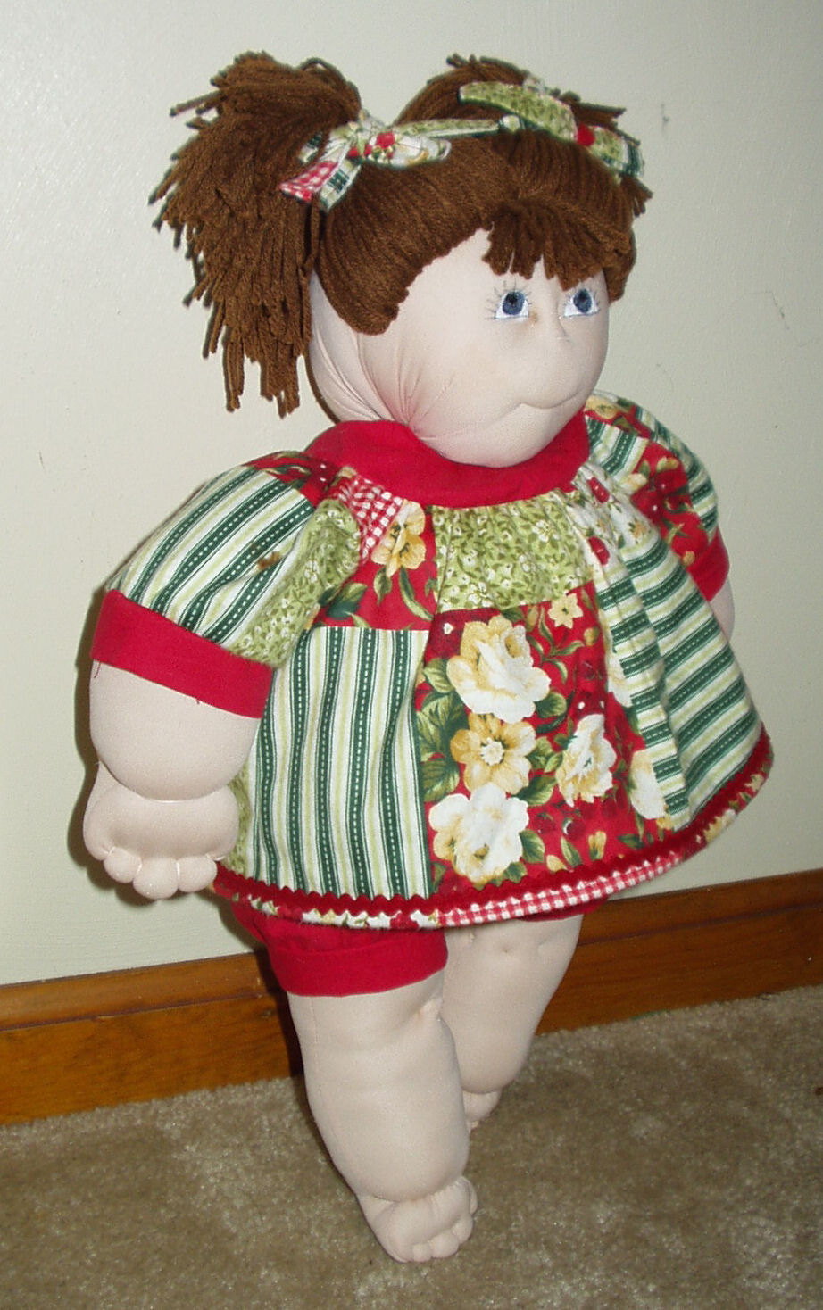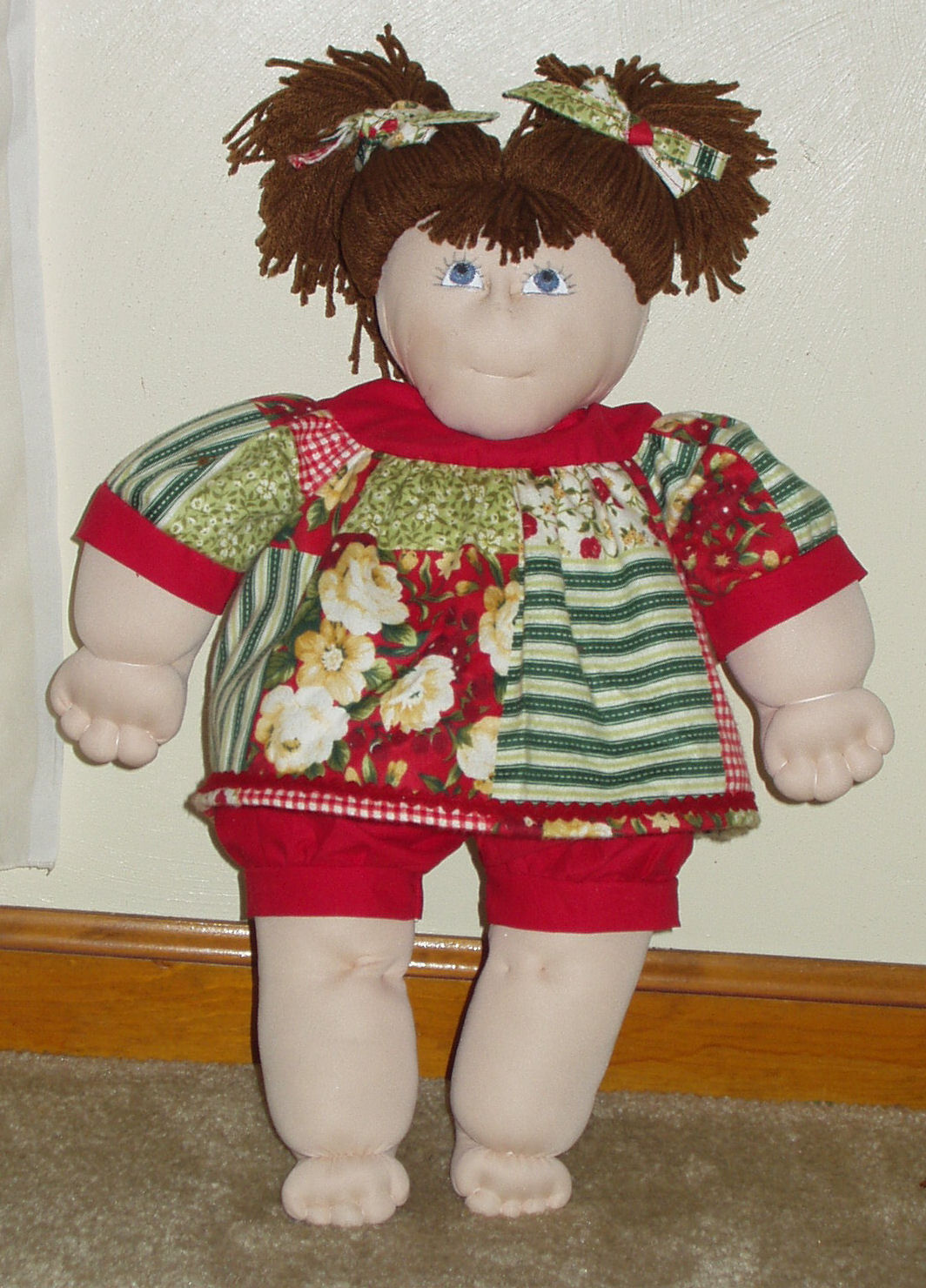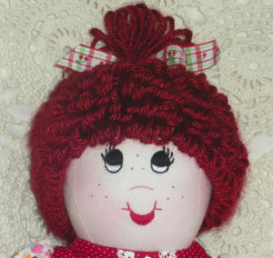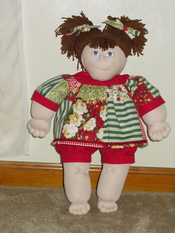 I used the basic pattern to make the body but changed the eyes. The Susie Ann doll has brown hair and she has beautiful blue painted eyes'. This pattern did not include the pattern for the clothing so I made a dress and bloomers for her. The Material is 100% cotton which has a patch pattern on it, I added some red cotton on the bodice and on the end of the sleeves to enhance the outfit and the bloomers are also in red. I also used -ply Worsted Weight Yarn for the hair.