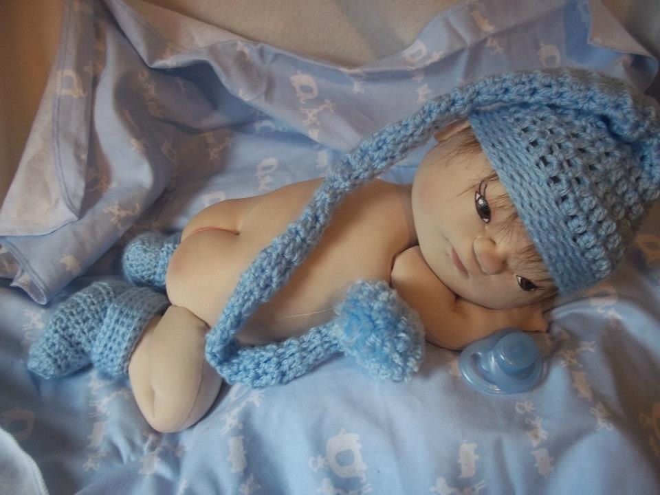 I'd like to introduce Noah. He is a newborn just arriving in this world and excited to be going home from the hospital. Noah is an original pattern designed by me. He is 18 inches long, anatomically correct and heavily weighted for a realistic feel. Noah even has a fresh baby powder smell. He has painted eyes and is completely soft sculpted for a realistic look. The stocking cap and booties are crocheted my me and he has a diaper, magnetic paci and is bundled in a soft flannel receiving blanket for the trip home.