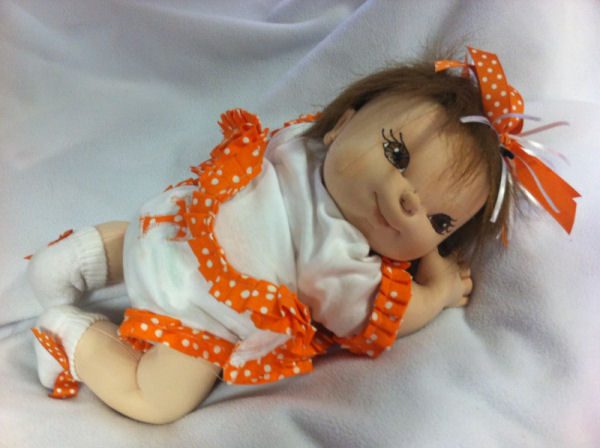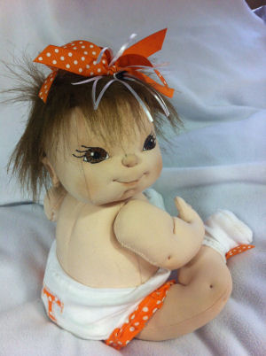 Meet Belle... She's a future cheerleader for the Tennessee Vols! She's as sweet as they come! She's only seven months old, but she absolutely loves sports. She cannot wait for the football season to start up again! You'll never guess what she wants to be when she grows up!!! Belle is made from deer suede and lightly weighted. She is about 15 inches tall and fully soft sculpted. Her eyes are painted and her hair is made of fur. Her outfit is a onesie that I cut in half to make a two piece set. I added ruffle and Appliqué to complete the set. She's completed with a matching hair-bow (made by me) and a magnetic pacifier.