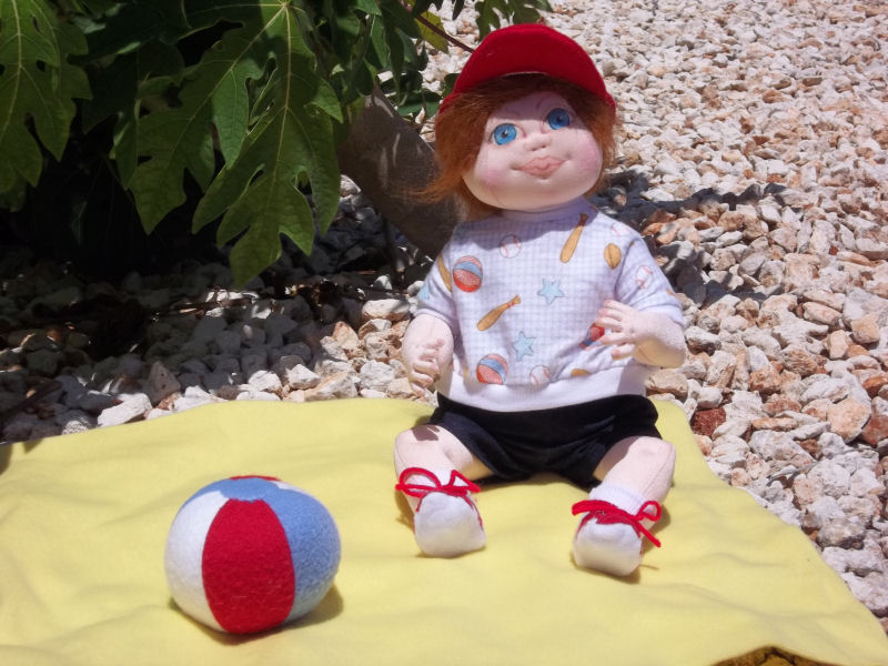Max is about 15'' tall. He is created by a pattern designed by me. He is made using doll face craft velour on his body. He is fully jointed and sculpted. His facial features are done by colored pencils and gel pens. His t-shirt,shorts,diaper,socks and hat that he is wearing are all my original clothing designs,and his shoes are from a purchased shoe pattern.