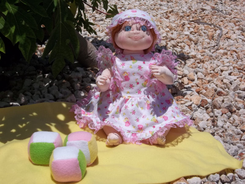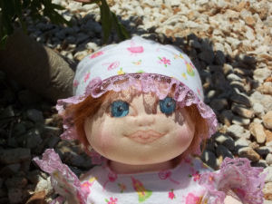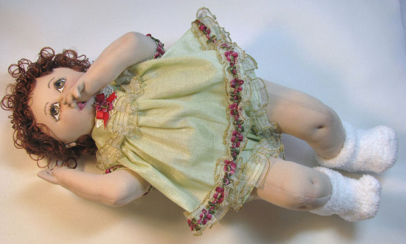Polly Rose is my original design for the 2013 Baby Doll Challenge. The inspiration for this little one is based on a real life granddaughter named Polly Rose.. She is 15" long and constructed with doleskin fabric. Her arms are jointed while her legs are stationary. Her dress and panties are my own design. Her booties were made from the lower portion of purchased infant socks. My Polly Rose loves to suck her thumb and gaze in wonder at the world around her. She was fun to make and I hope you enjoy her wide-eyed wonder.