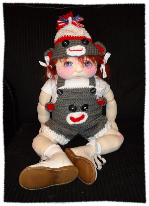 Erica was originated from the pattern Dream Spinners Late addition. I used the basic pattern to make the body and added pellets in the body for weight. The Erica doll has wavy blonde hair made from 4-ply Worsted Weight Yarn; she has beautiful brown embroidered eyes'. This pattern did include directions for the cloths so I did make them from 100% cotton which has a sheen look to it that makes it very elegant. I also used the yarn for the end of the dress sleeves and on the waste and legs of the panty looms.