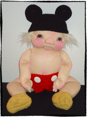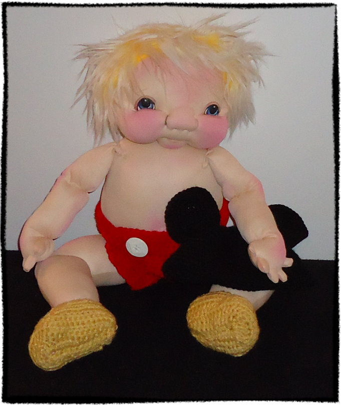 This is Mowse, a little baby boy created from my own pattern. He is fully soft sculpted with a jointed head and legs. I did his eyes with water color pencils and his hair is a two tone fur. I crocheted his hat, diaper, and booties using a pattern by Magic Rabbit Patterns that I modified. He can wear a mix between 0-3 and 3-6 months real baby clothes.