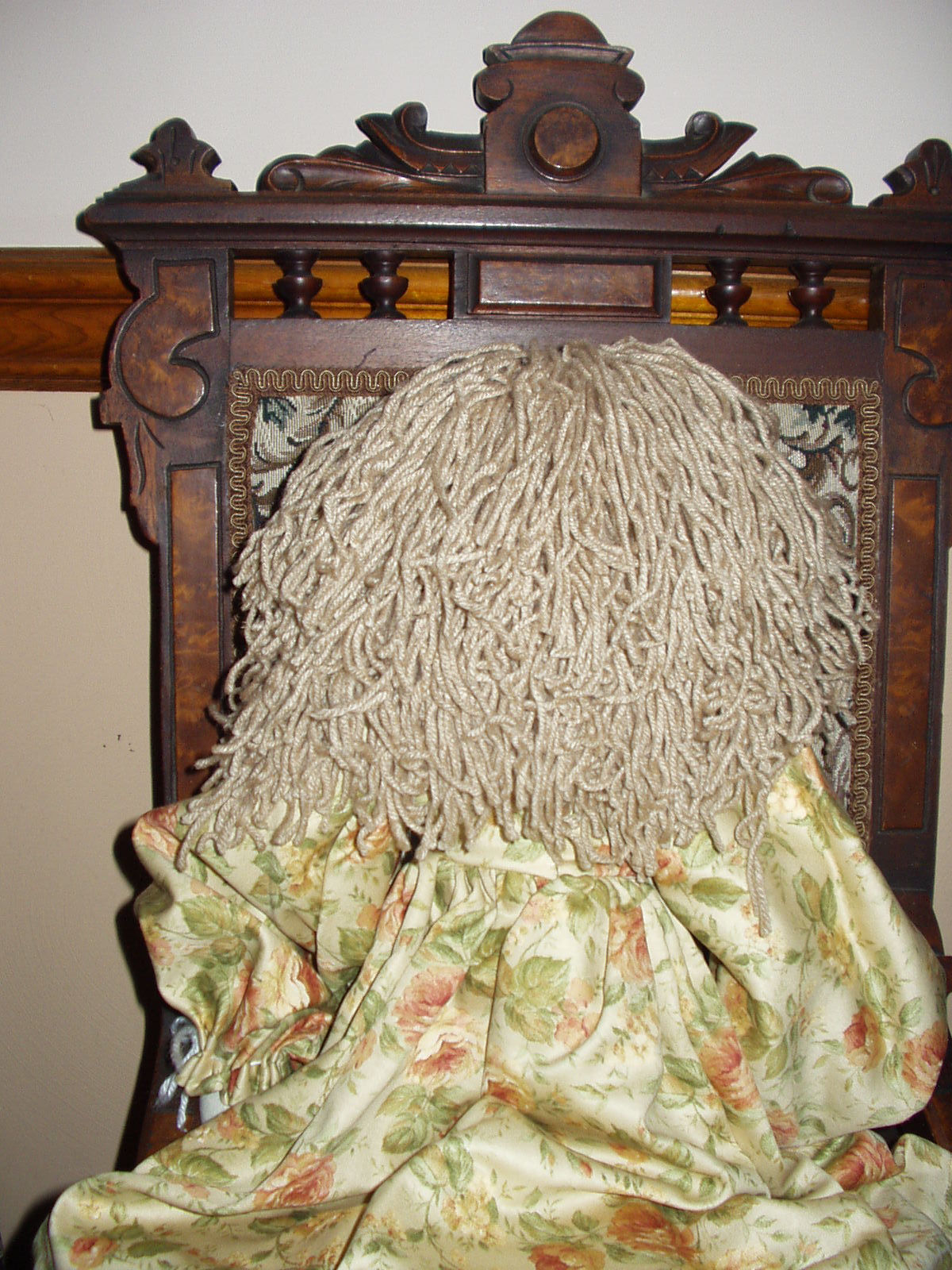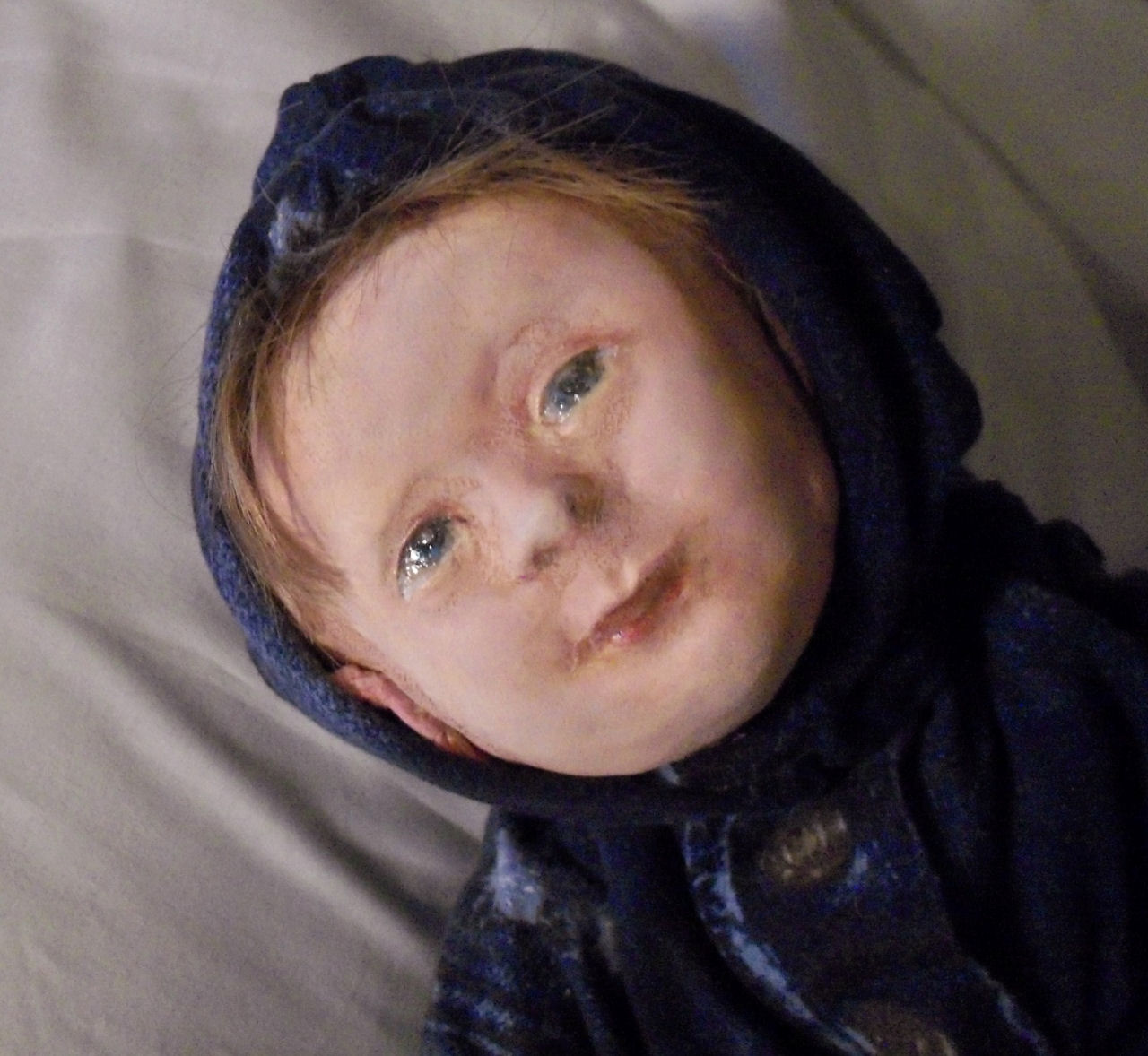 He has silk gauze over my own modeled paper clay mask attached to a weighted stuffed cloth head and body. He is a life-sized