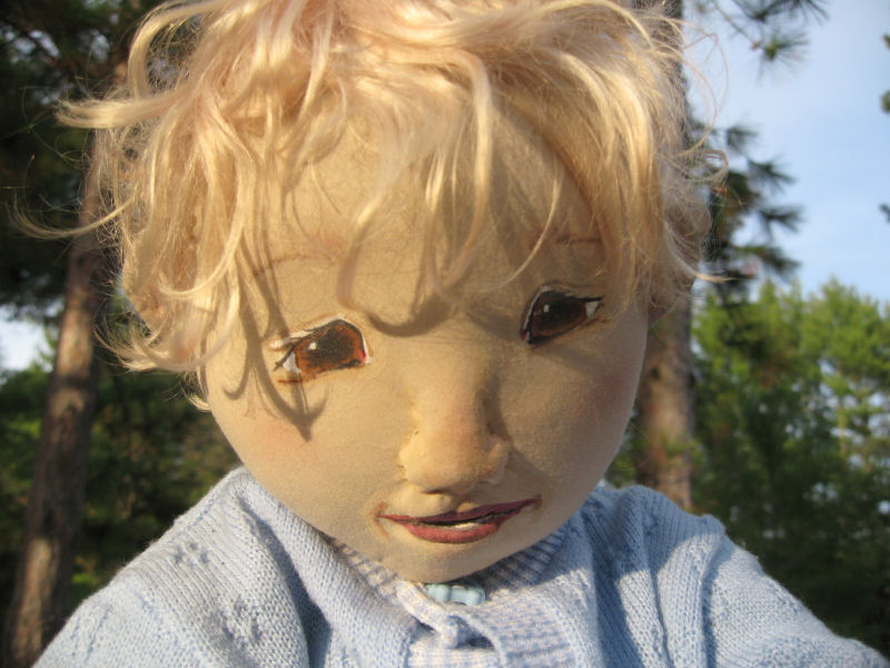 His body is multi-jointed of polyester cotton blend fabric, which gives perfect balance for posing unaided. Mohair wig, acrylic features and a cast-off baby outfit complets his charm as a true little prince.