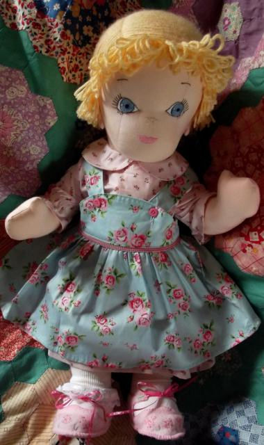 This doll I have made is called Laura, because she was made using a pattern by Laura Wheeler. Laura is 21" tall and she wears size 6 months. She is wearing a dress that I found in a second hand store and shortened for her. The shoes where handmade for her by me. Laura is made out of a pink cotton blend, with yarn hair. Her face is hand embroidered, I think she turned out beautiful. What do you think?