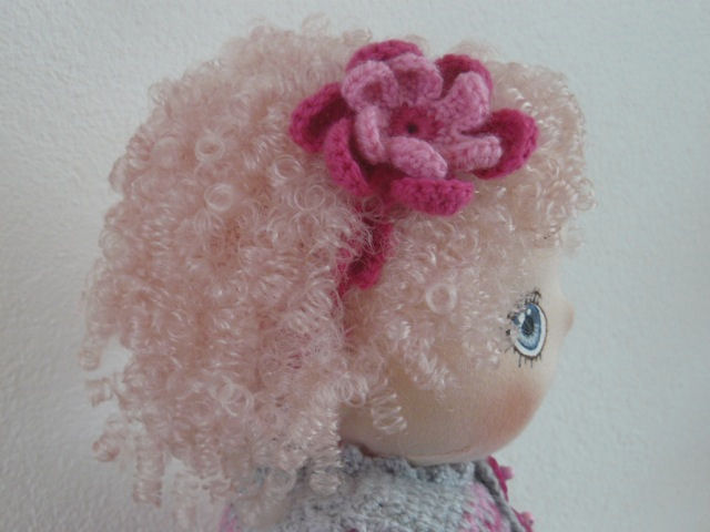 This is Renske. She is a soft cloth doll and she is 38 cm (15 inch) tall. Her skin is made of tricot and her cute little curls are made of synthetic fiber that is knotted on a crocheted cap. Her grey eyes are handpainted with fabric paint. Her hands, toes, elbows and knees are soft sculptured. Her limbs are jointed and she can sit by herself. Renske wears a crocheted dress, shoes and hairband with a big flower. Under that she wears a t-shirt and a legging from tricot.