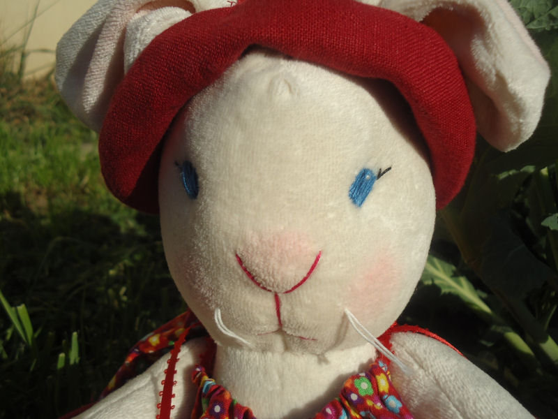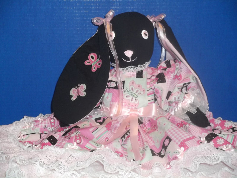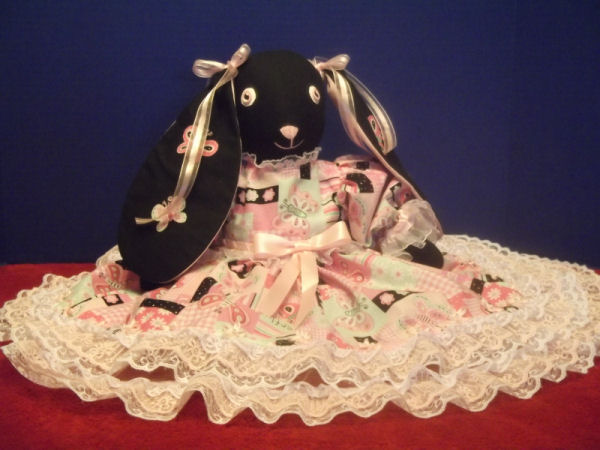 My beautiful rabbit that I made is from an old pattern that I found in my pattern box. My baby is called "Snow" and she is about 18" tall when standing. Snow's body was made from broadcloth and her outfit is a cute pink print pattern of cotton with lots and lots of lace. Snow has a beautiful personality when she smiles which is a lot. Snow looks lovely sitting in my sewing room watching everything that goes on.