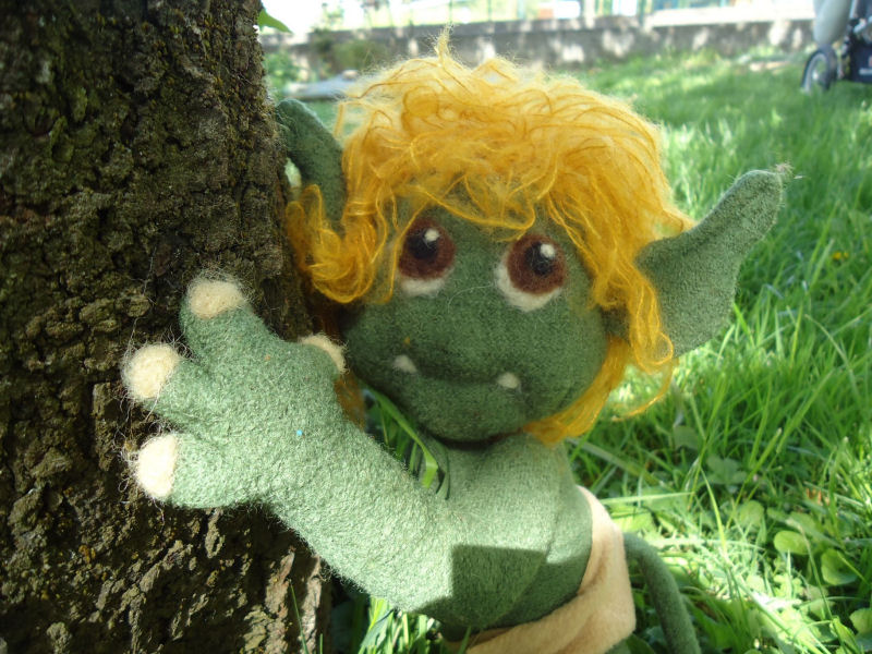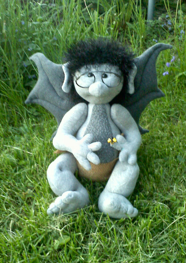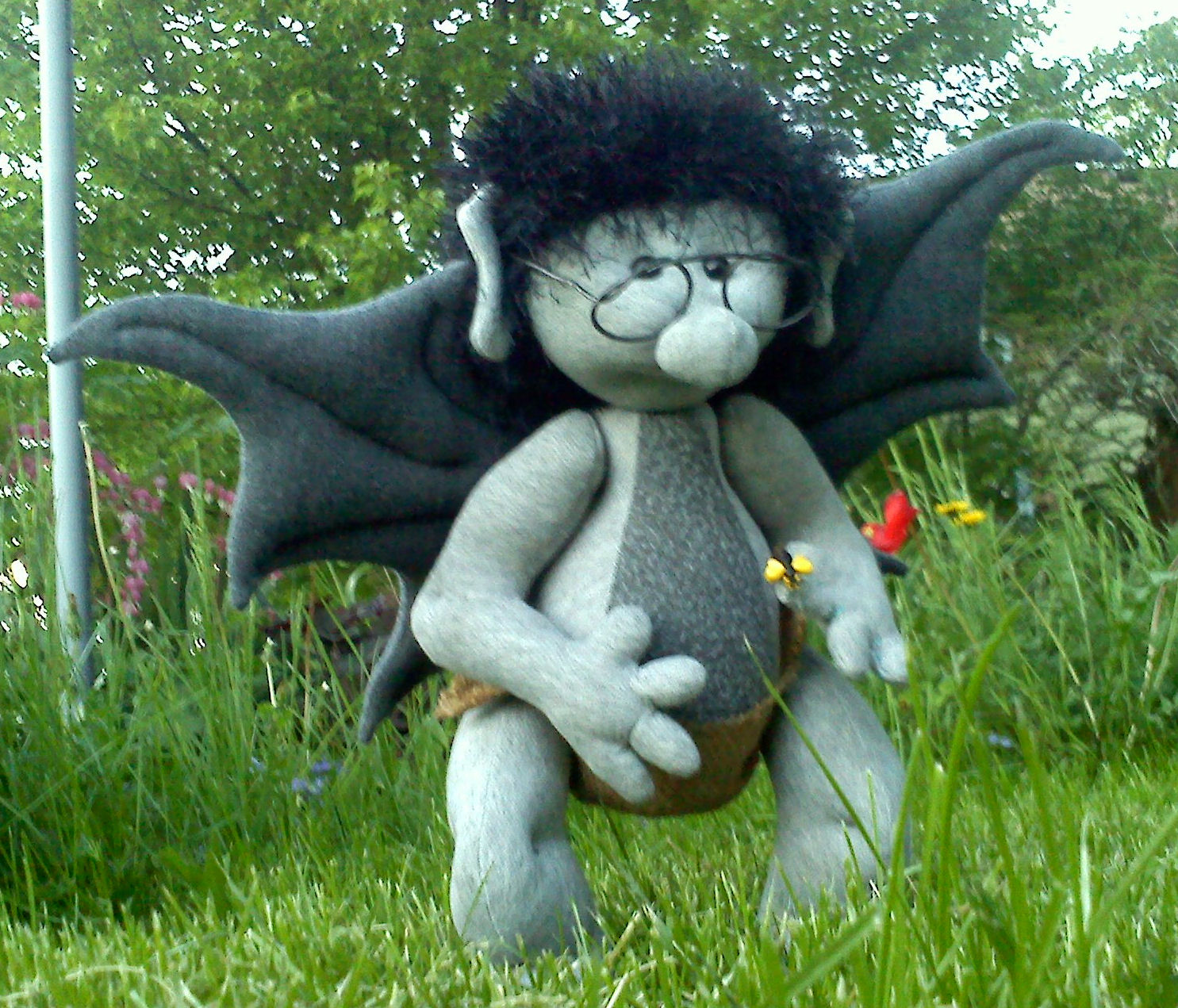 Fergul is made from my own design. He is made out of recycled sweat cloths. His hair is a fun fur crocheted wig. He is sporting his burlap diaper and glasses. He has jointed arms and legs and can stand on his own. As you can see he is very curious and likes the outdoors.