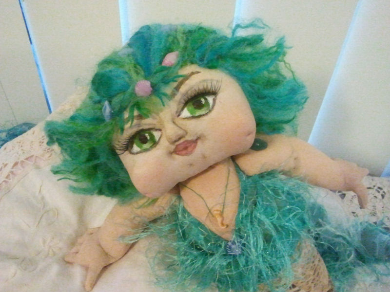 She is a very young mermaid, she has hair and a feathered tail that is green/blue so she is camouflaged from predators who may want to catch her. Her hair waves with the ocean currents to look like seaweed. She has a short tail which will grow as she does. She will be a beauty due to her already lovely eyes and long eyelashes.
