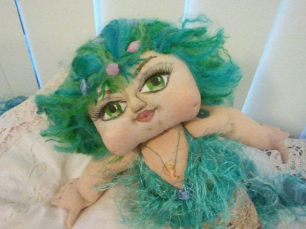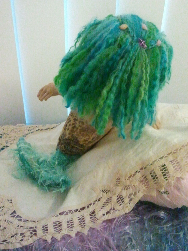 and her face hands and feet are made with doe suede, her hair is a piece I cut from a wig.