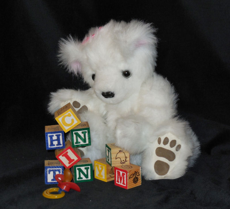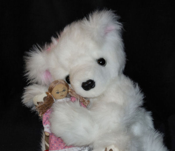 Enid is a jointed teddy made of thick, white fun fur with pink fun fur inserted in the inside ears, the nose is shaved to a plush level. All 4 paws are ultrasuede with paw prints appliquéd on using an old air mattress remnants. Safety eyes and nose have been used to ensure safe play by young children.