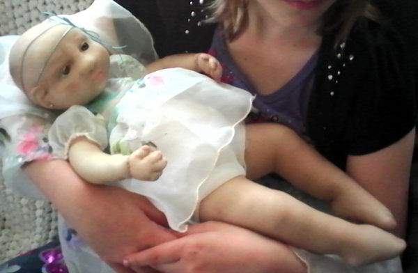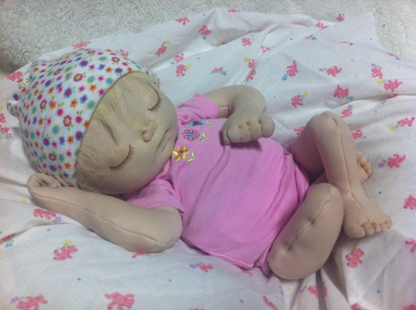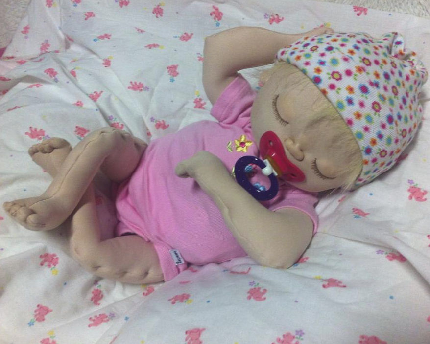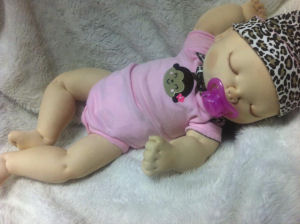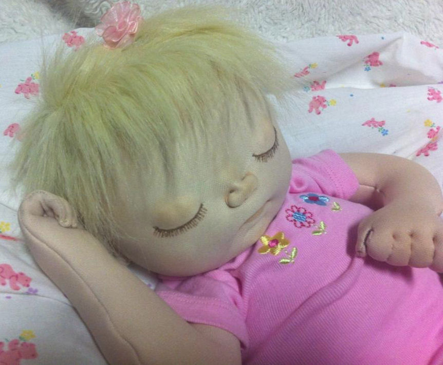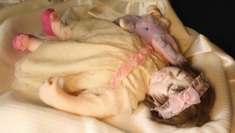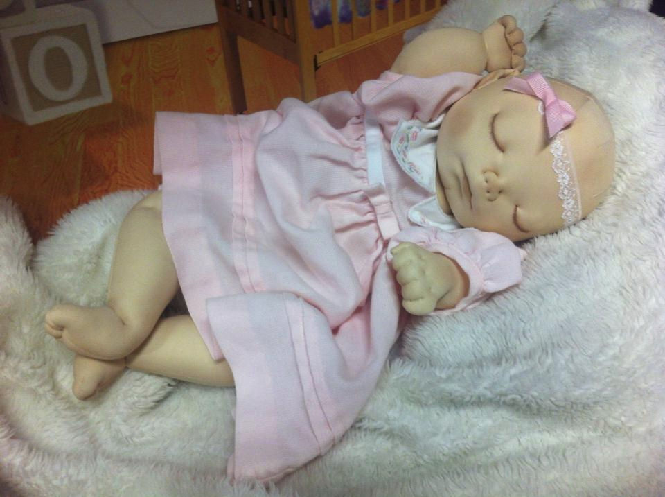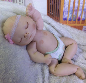 Rose is made from a sculpting fabric and is about 17" long. She is bald with sleepy eyes. She is fully soft sculpted with all ten toes and all ten fingers. And she is anatomically correct. Rose is heavily weighted for a realistic feel. Her head will need supporting just like a real newborn baby.