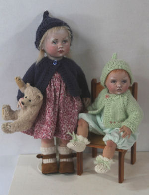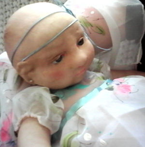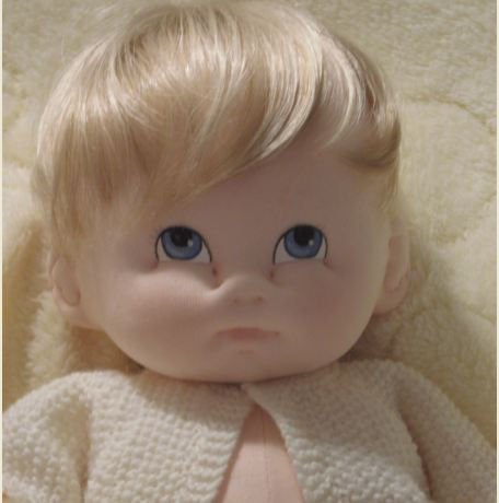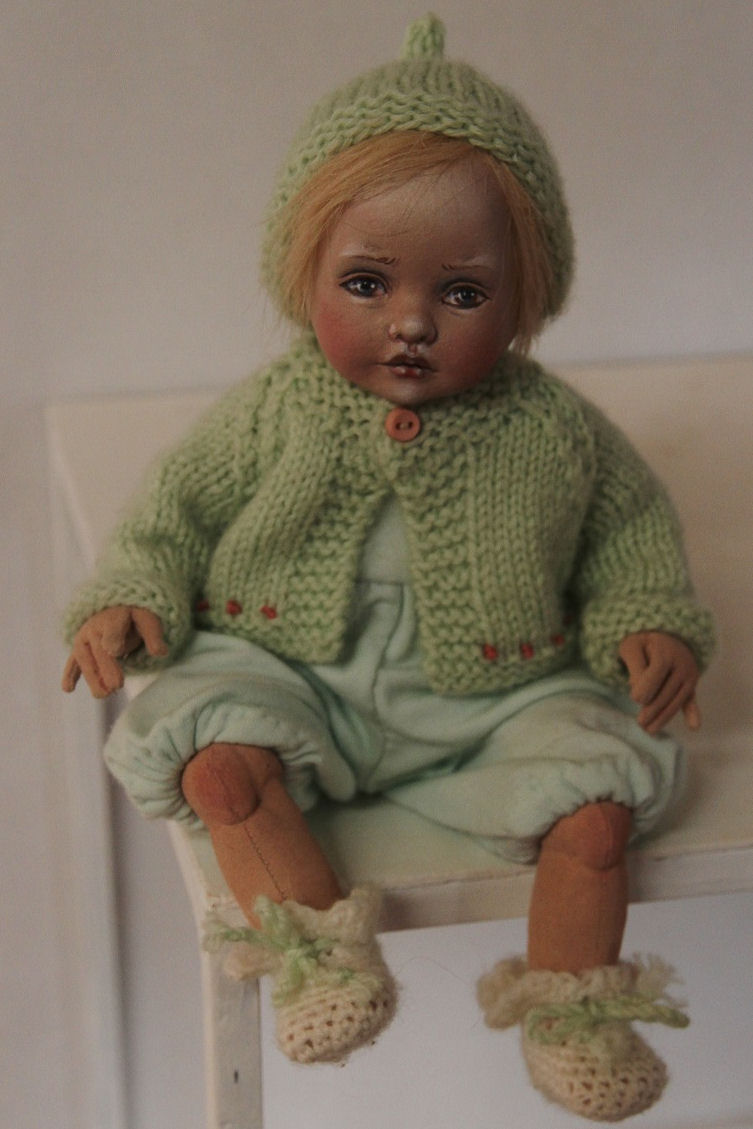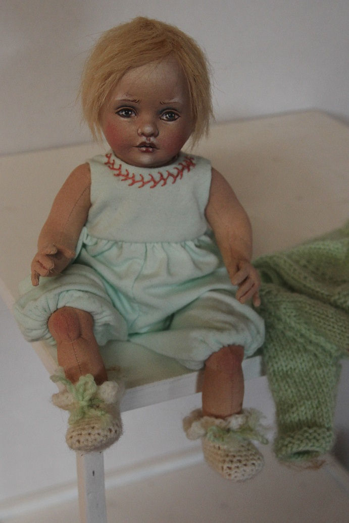 a touch of pink embroidery, a knitted hat and cardigan and crochet booties. "Baby's" head is made from moulded knit fabric over a paperclay support and it has been sealed and then painted with artist's acrylics. Her hair is blonde fur fabric, painstakingly applied.
