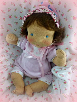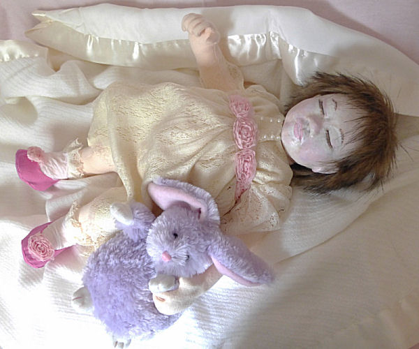 Sophie is my original design. She is 16 inches long and has a fabric molded head. Her joints are movable. All of her clothing was designed and made just for her by me. I used some 1920's vintage lace and cream silk, left over from a wedding dress I made last year, to create her little dress. Her hair is craft fur. The little stuffed rabbit that she was clutching is store bought and "borrowed" from an older "sister". The ribbon headpiece in one picture is also store bought. The baby blanket that she is lying on is a family heirloom. She was a joy to design and create.