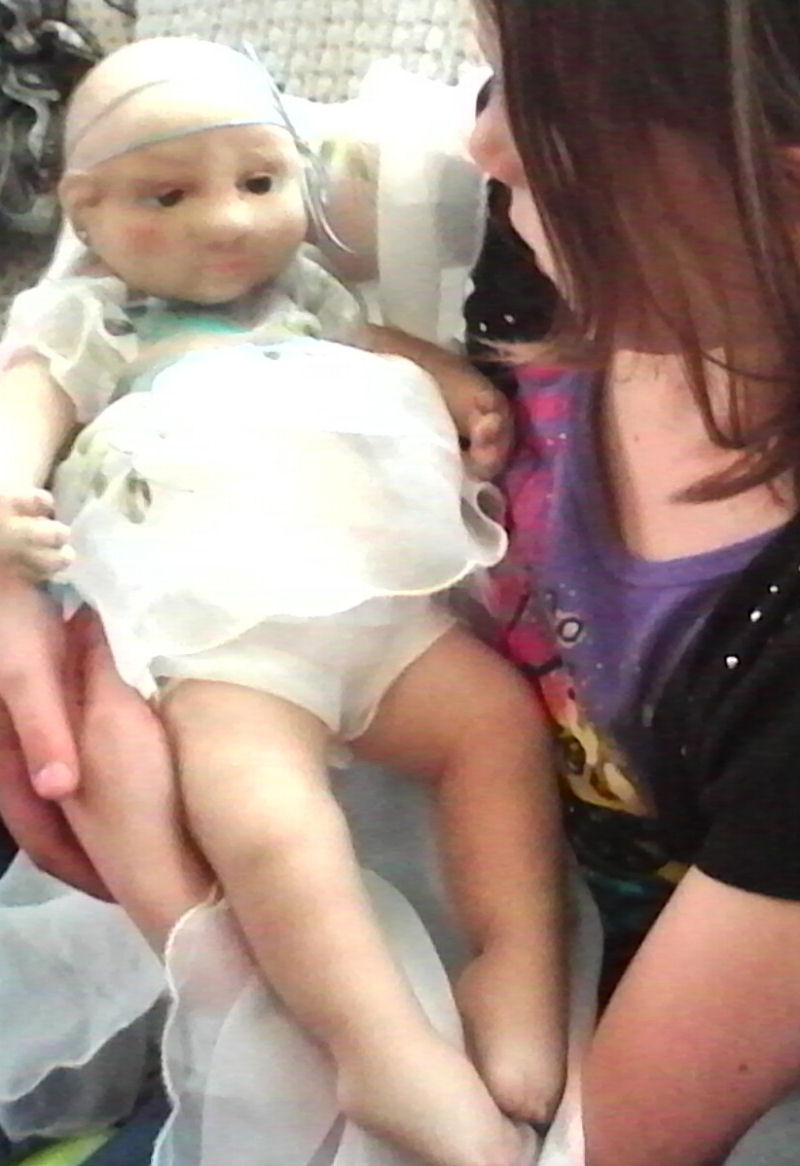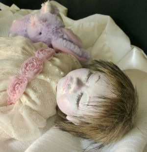 Makayla is made from a sculpting fabric and is about 19" long. She has a head full of blonde hair with sleepy eyes. She is fully soft sculpted with all ten toes and all ten fingers. And she is anatomically correct. Makayla is heavily weighted for a realistic feel. Her head will need supporting just like a real newborn baby. She is made with doll pellets for realism.