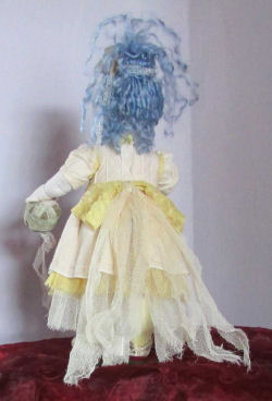 Bluish is a baby ghost inspired to the gothic legend of a blue hair and pink eyes little child who truly lived in my country in 1400th (Azzurrina of Montebello). She was a Lords' little daughter and, 'cause of her strange look, folks feared she was a witch so mummy shut her up safe in the castle with two bodyguards but one day she mysteriously disappeared while toddling below her ragball and a dark, sad story tells her ghost wanders through the mazes of the castle calling "Mamma". Really I guess she went away with Circus where lived a long happy life together with other very special people.