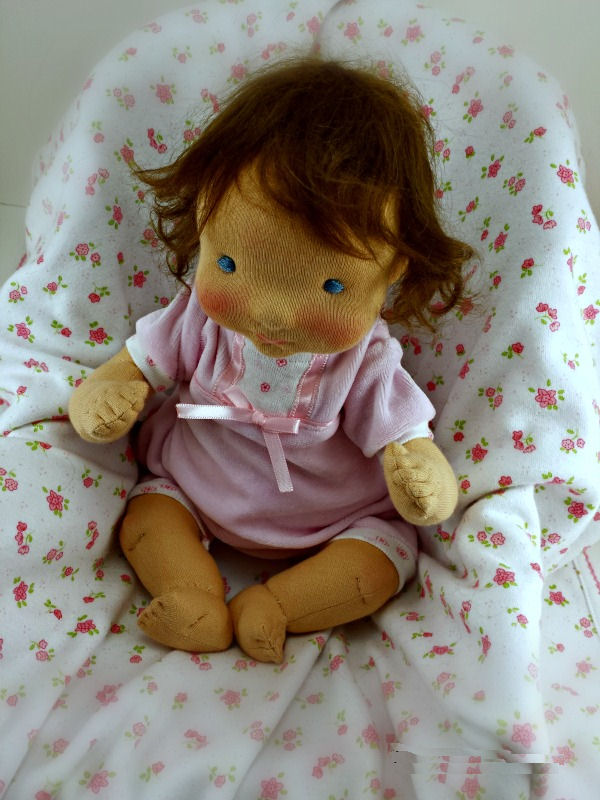 This is Cece, she was made using natural materials. She is made with a combination of different techniques. Based on waldorf doll heads, the inner head is made from tightly rolled wool. Needle felting techniques are used to add facial features and then a cloth over method to cover the wool. Facial details are enforced with coloring and stitches. Her eyes are embroidered with cotton floss. No paints are used only natural beeswax crayons. Her hair is a wig made from natural mohair. Her torso is filled with wool and doll weighting glass beads for extra weight. She is made from my own pattern inspired by vintage dolls with floppy limbs. She has fabric joints which allow her limbs to easily pose. She can sit or lie flat. She is approx 12/13" long. Her romper is handmade by me from my own pattern, which was designed after an outfit my daughter had as a baby. Her bonnet is handmade from my own pattern, designed to look like a pixie bonnet.