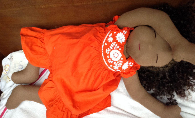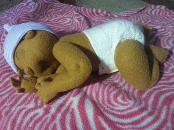 Babee was made from Barbara Willis doll pattern. She is made with a clay mask covered with a stretch cotton. Body and clothes made from cotton. She is taking a nap now from mama.