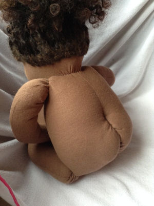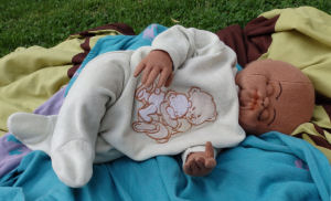 This babydoll is a demonstration doll and is weighted with sand and steel microbeads. The weight is carefully distributed. The rest of the doll is stuffed with kapok and polyester fiberfill. This doll can take real baby positions and feels like a real one ! I made several of them : chocolate or pink flesh, open or closed eyes, with or without hair (if the doll has hair, I paint it with acrylic paint and iron it)