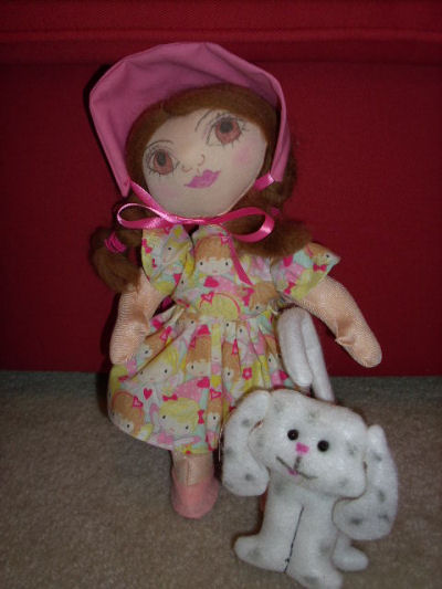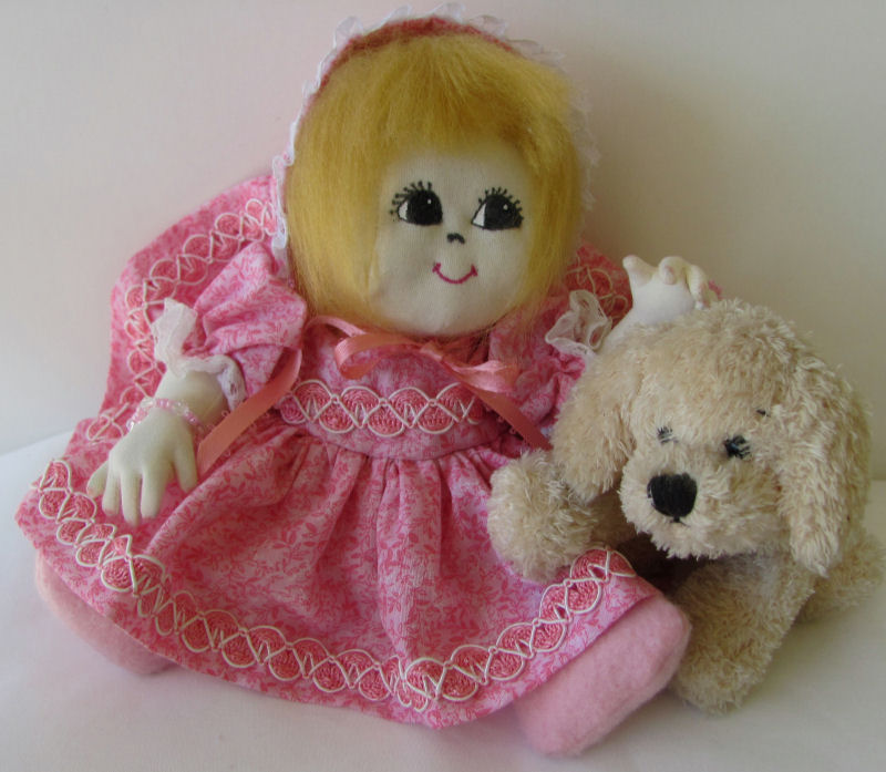 She is made from polyester knit and her hair is fake fur. Pens were used on her face. Her booties are made from fleece and her dress cotton fabric. She has a ring, bracelet, and pink fingernails. I made every thing on Karen. Puppy is purchased.