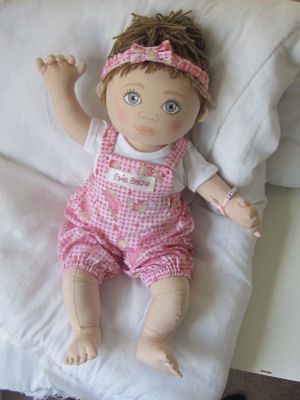 Evie Beau is approximately 22" long. She was made in craft cotton using a combination of Judi Ward's pattern for "Bobbi" a simple baby doll from which I used the body & limbs & Kezi Matthew's "Blye & Colton" pattern which I increased the size of the head to fit the "Bobbi" body. I painted the face entirely freehand using acrylics,coloured pencils,fineliner pens & blusher. I made the hair from knitting yarn. The romper suit & hairband are my own design & make. Evie is wearing a purchased premature baby vest & disposable nappy & a purchased dummy. Evie is as bright as a button & loves to lie on her mat & kick. She loves her little toy dog (purchased but belonged to my son 30 years ago!!).