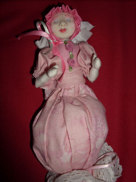 This doll presented some new challenges for me. The biggest challenge was making the open mouth on both sides of her head. Her head is on a doll joint, so it can easily be made to look like she is wide awake, with just a turn of the head, she is asleep. The 'sleeping side' of her face was also a new challenge for me; I had to make the eyelids with lashes so that she looked like she was sleeping on that side. The class I took to make her was great because I was able to work at my own pace, and the directions and patterns were always clear and easy . The class even had the patterns for the clothing and shoes. I don't make a lot of dolls , but I like to try and make a new doll to enter that will not only challenge me, but will also make someone smile when they see her..