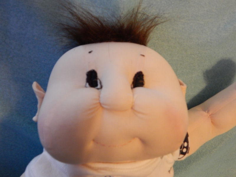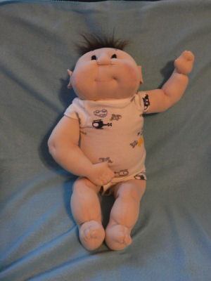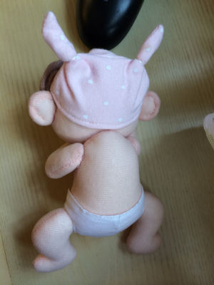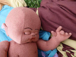 The pattern of this doll is mine. My pattern is based on newborn Alice pattern by Judi Ward and the preemie pattern by Sandy Eding. This doll is a newborn and is made with velour and has a fleece 'under-skin', so the doll is softer and strong. He has plastic joints at arms and hips. The face which is embroidered, the toes, the nipples and belly-button are needlesculpted. The fingers are articulated with chenille stems and he has an opposable thumb. He has a wobbly head. He wears real baby cloth.