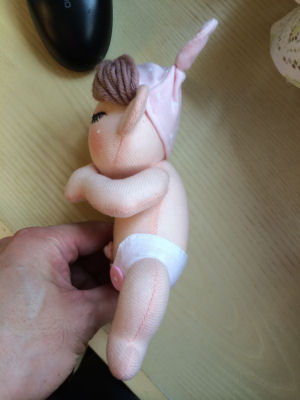 8 inch six months baby doll. All natural materials. Soft cotton interlock body, pure wool stuffing, Mohair hair. Cotton embroidered face. Niddle Cotton clothing.
