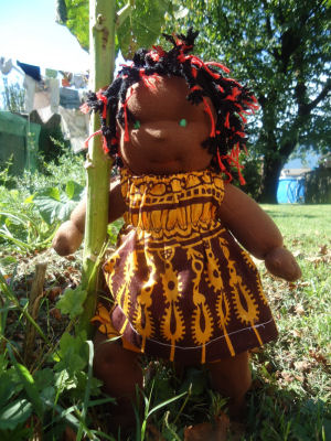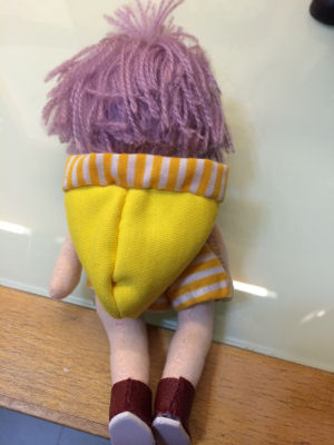 She's in jersey knit and button jointed at arms and hips. She's stuffed with carded wool. Her face is lightly needlesculpted and is embroidered. Her hair is made in wool.