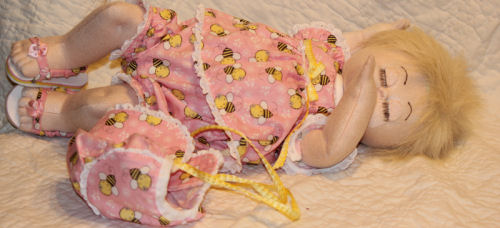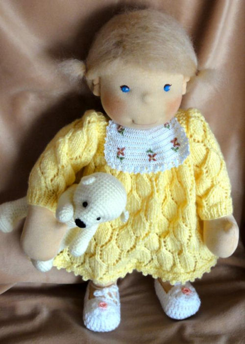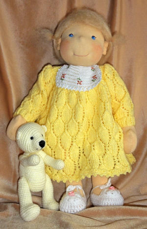 Karen is a 9" baby, made from Judi Ward's pattern: Tiny Baby Love. Her dress was made from the same pattern.