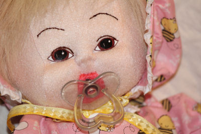 This baby doll is made from a class on the Doll net website. The designer of the doll is Gail Kellison. She is the Awake/Asleep Pacifier Doll. I am naming her Gwen after my youngest granddaughter.
