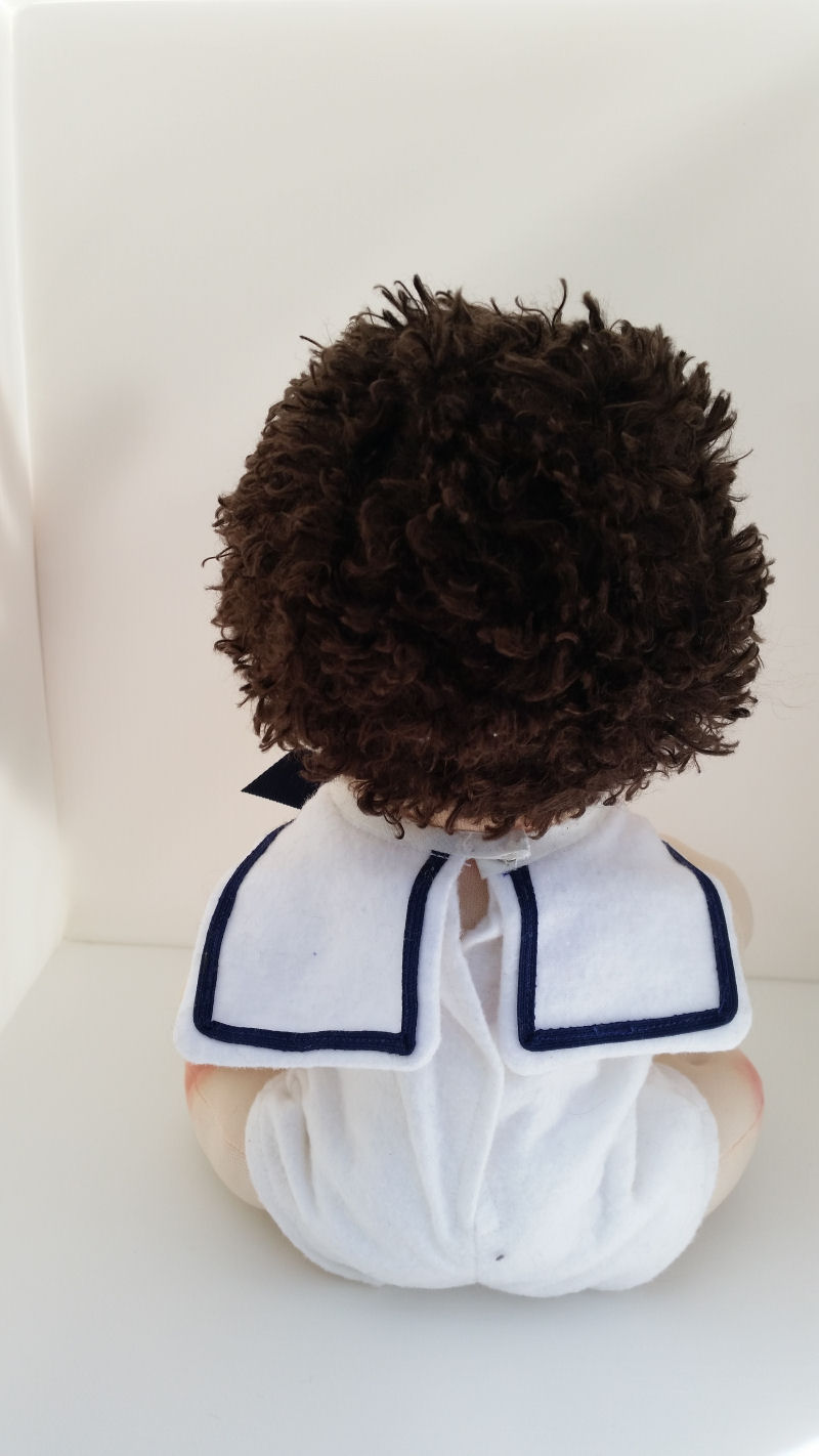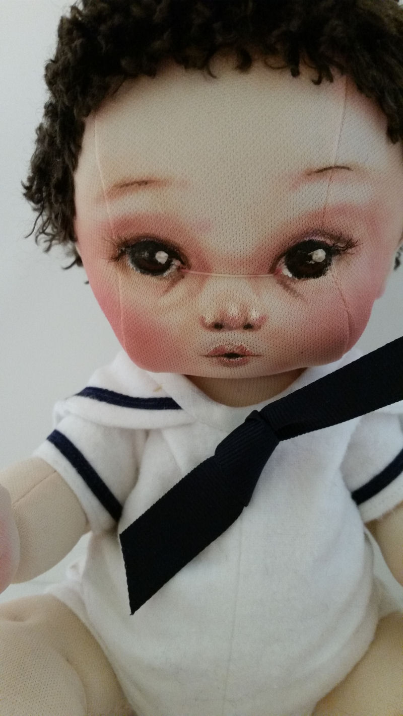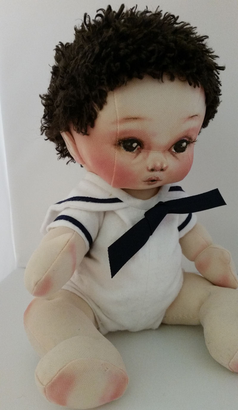 This is my doll; his name is "Ari". He is 12 inches high. I made him using a vintage Alice Brooks pattern and Windsor Comfort material. His features were painted using a combination of airbrush and fine paintbrush details, and his wig is made out of curly fleece material from a pattern I designed myself. His little sailor outfit is made out of flannel and trim using a vintage Carolee Creations pattern. And though you cannot see it, he is wearing a handmade flannel diaper fastened with small blue safety pins.