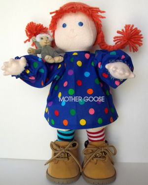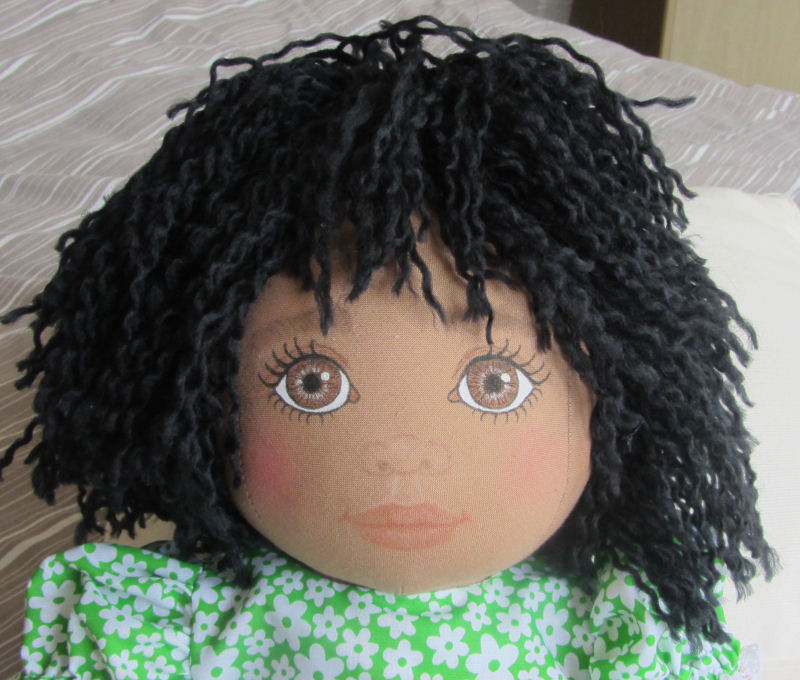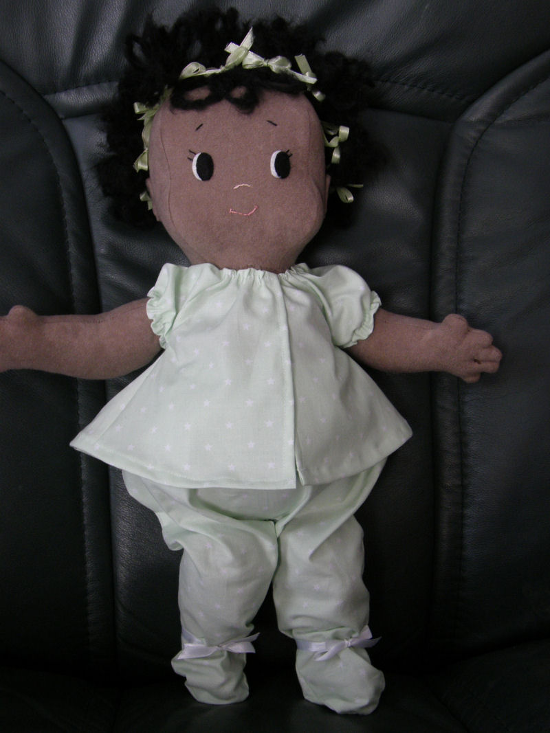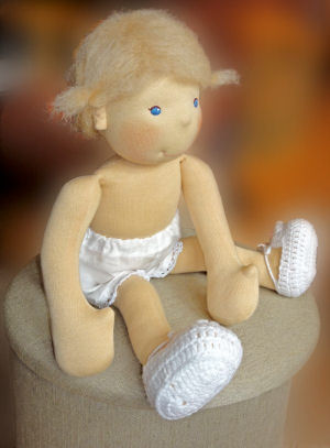 7 inch style baby doll. All natural materials. Soft cotton interlock body, pure wool stuffing, Mohair hair. Cotton embroidered face. Cotton clothing.