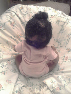 Baby Sera isn't quite awake from the night. Her days and nights are still confused. She just learned to sit, and Mommy hoped that propping her up gently might wake her up. To no avail! Sera is still about to topple over as Mommy tries to get her ready for the day. Gramma says that all of her baby milk has gone to her hair, and she doesn't have enough cushioning on her bottom! Finally ready, she stretches out, eyes still closed.