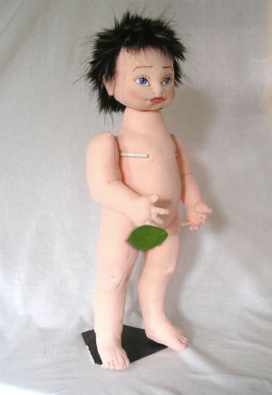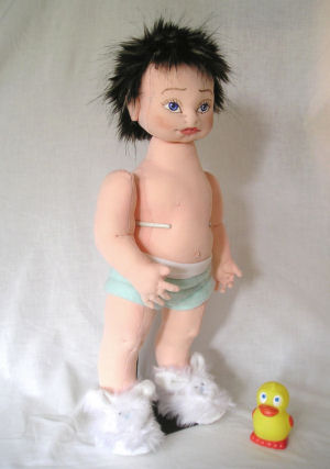 Bobby is made of cloth and has a needle sculpted face. His face has been painted with acrylics. This doll was made using a wire armature and its hands have been wired for movement. He is anatomically correct. I have used the "Mimi universal toddle" pattern of Mimi Kirchner. I have also made his robe, underwear and slippers. He is a cute little boy and children love him!!