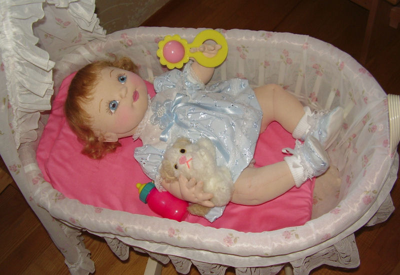 Belinda is almost 8 months old and she has learned to sit well by alone. She is very proud of herself being able to do this and she likes to play with her many toys. Belinda has pretty baby wicker crib, where she can sleep, when she gets tired of playing. Her mother has sewn her dress and matching bonnet, panties and bootees from eyelet fabric and trimmed them with lace. Her toys are purchased.