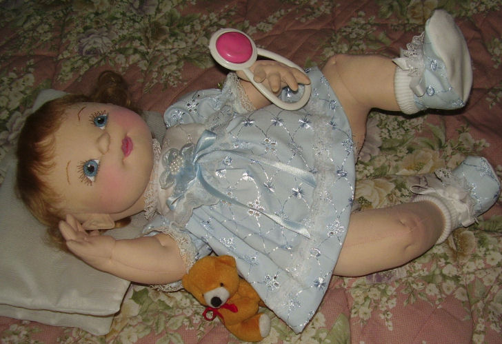 This is my baby doll Belinda. She is made from Darlene Rausch's wonderful Bonnie pattern. Pattern was in Soft Dolls and Animals September 2009 issue. I love Darlene's doll patterns, because they have no seams in their face.