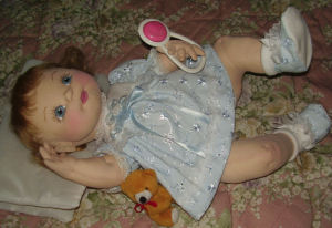 Her name is Catherina and she is made from Darlene Rausch's excellent doll pattern Elaine. I enjoy making dolls by Darlene's doll patterns, because they have no seams on their face. Catherina is approximately 21 inches tall. She is quite a big baby doll and she can wear real baby clothes. She is soft sculpted doll and made from polyester knit fabric. Catherna's legs and arms are movable, because they have plastic joints. I painted her eyes and lips with acrylic paints. Her eyelids and eyebrows are embroidered. Her wig is auburn color purchased wig, which is sewn onto her head.