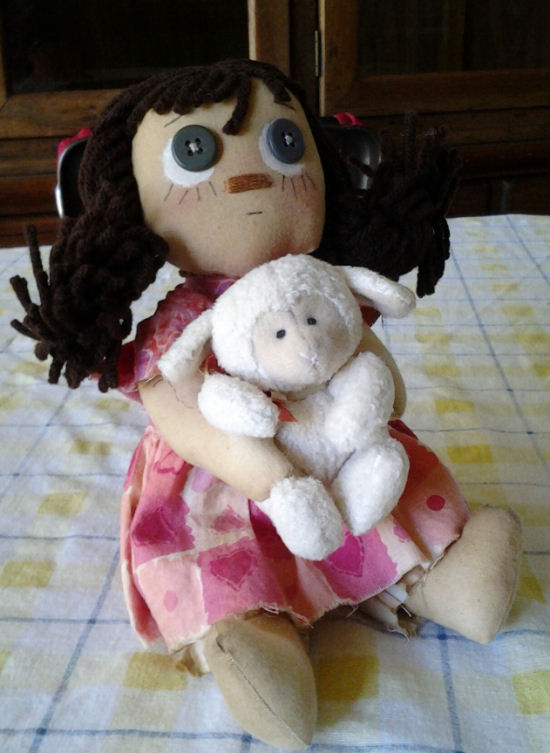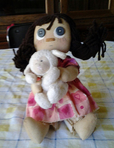 My name is Anne and I was made from a free pattern from the internet about 3 years ago, can't remember the name of the designer. I'm about 10 months old and I have my Easter lamb with me. Dress is torn out rather than cut, was fun to make this doll, thanks to the designer.