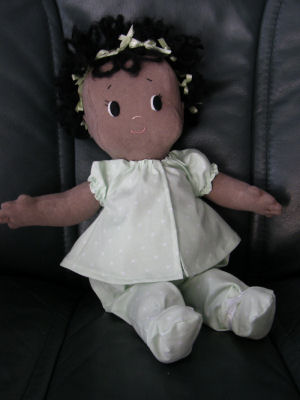 This is a pattern that I designed myself. She is meant to be a doll that can be played with and hugged, and so it has minimal seams and is stuffed lightly. Her 100% cotton skin is stuffed with Polyfil throughout. She has a wig cap made from salon quality human hair extensions. These have been finger combed into several styles, and do not tangle. Sera can fit newborn size clothes, diapers, and shoes. She is wearing clothing purchased for my youngest daughter and was "handed down" when it no longer fit.