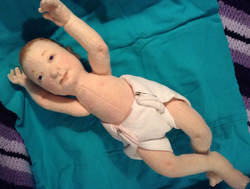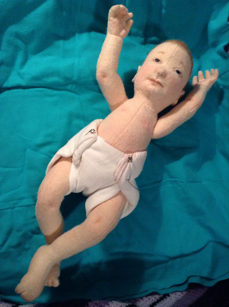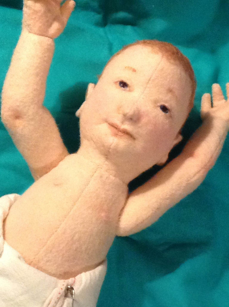 Daniel is made from wool and rayon felt. His hair is chopped and separated yarn and his features are colored pencil and micron pens. He is wearing a vintage tea towel as a diaper, much like those used by his mother in her infancy.