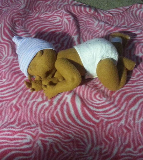 Meet baby Allie. She is brand new to the world. Baby Allie is made from Judi Ward's newborn Alice pattern with some added facial sculpting. Allie is made of light pink craft velour and is weighted with sand. She weighs almost five whole pounds and is about 20 inches long. She has brown craft fur hair and closed eyes with sweet little eyelashes. She smells like baby powder, just like a new baby, and is wearing her very first tiny little t-shirt, a newborn size diaper and her hospital bracelet. Her pacifier is removable.