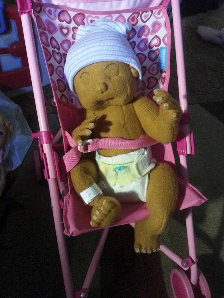 She is fully jointed. arms, legs and head. weighted to 4lbs. 13oz. (weight of grand daughter when she was born.)