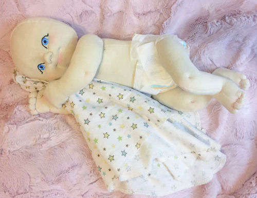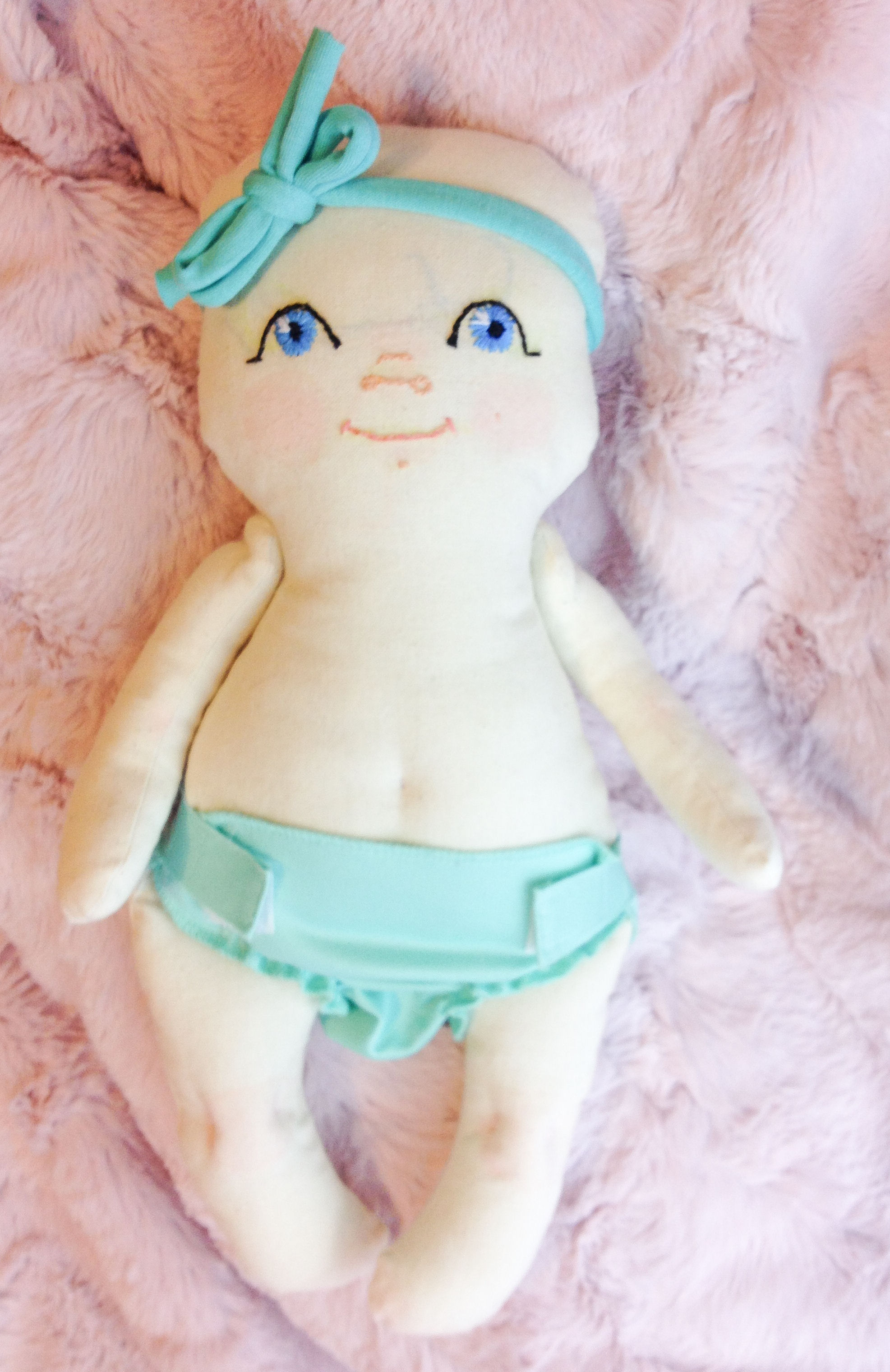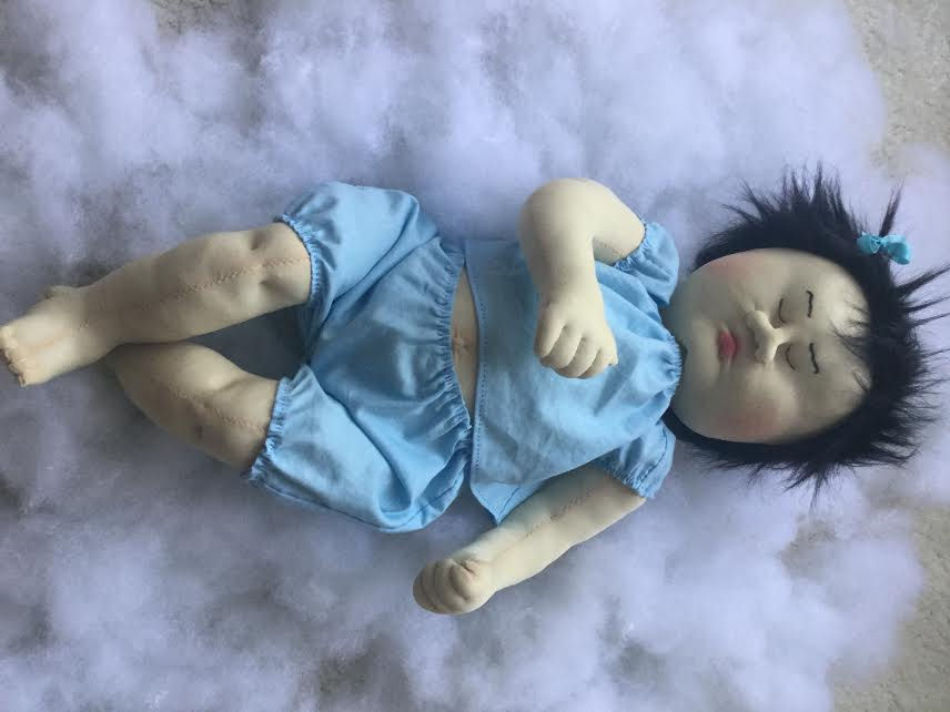 This tiny baby is smaller than preemie sized. She is sewn with cotton muslin and stuffed with poly-fil, her body is sculpted only at the knees, belly button, and elbows. I've hand embroidered her face, and blushed her with fabric paint. The pattern is made by me. Her arms are string jointed and her legs bend only at the top of the thighs. I made her headbands and onesie myself (the onesie even has working snaps!) Her little cloth diaper is store bought. I made this baby pattern this small size so that my children could easily carry her around and snuggle her!