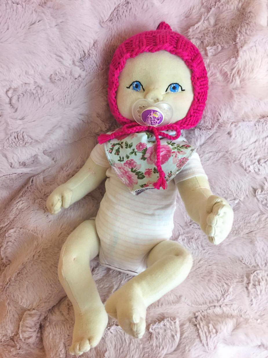 This sweet little baby girl is modeled after my daughter Scarlett Rose, the doll has long skinny legs and round cheeks just like she did! I made this doll with organic cotton interlock, she is stuffed with polyfill and slightly weighted with poly pellets that allow her to sit up on her own. She has posable limbs that are button jointed. I hand sculpted her face and body, her face is hand embroidered and blushed with coloured pencil. She is wearing a store bought onesie and store bought socks that my daughter actually wore when she was a newborn! I knitted her pink bonnet by hand and her drool bib is sewn by me. The little blanket she is cuddling is store bought and was also used by my daughter as a newborn! I designed and made the pattern for this baby myself, after lots of trial and error. I re-made this baby doll's head 3 times before I was happy with it! The doll can wear true preemie sized clothing. I had a lot of fun with this challenge and I'm happy I found this site!