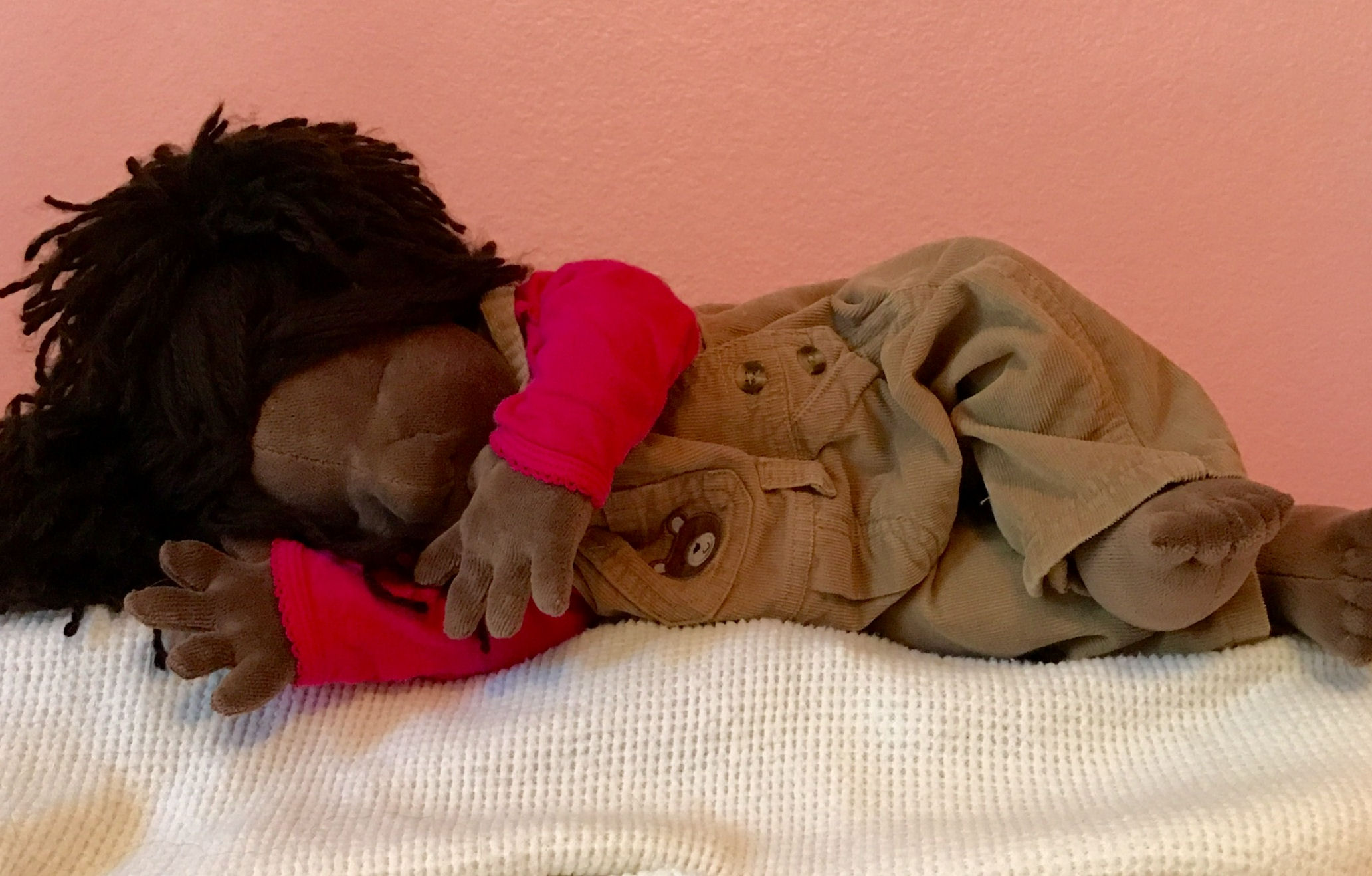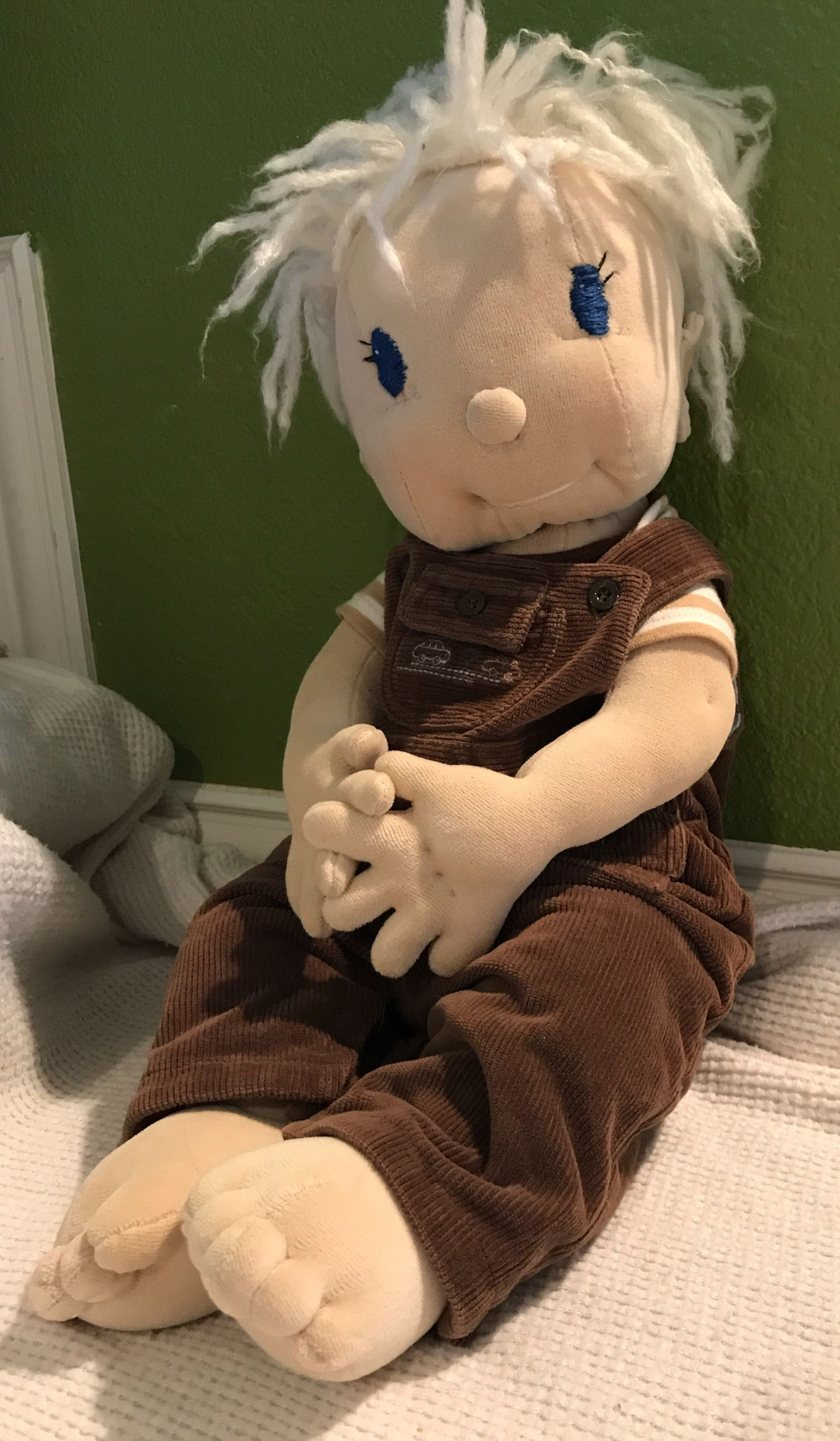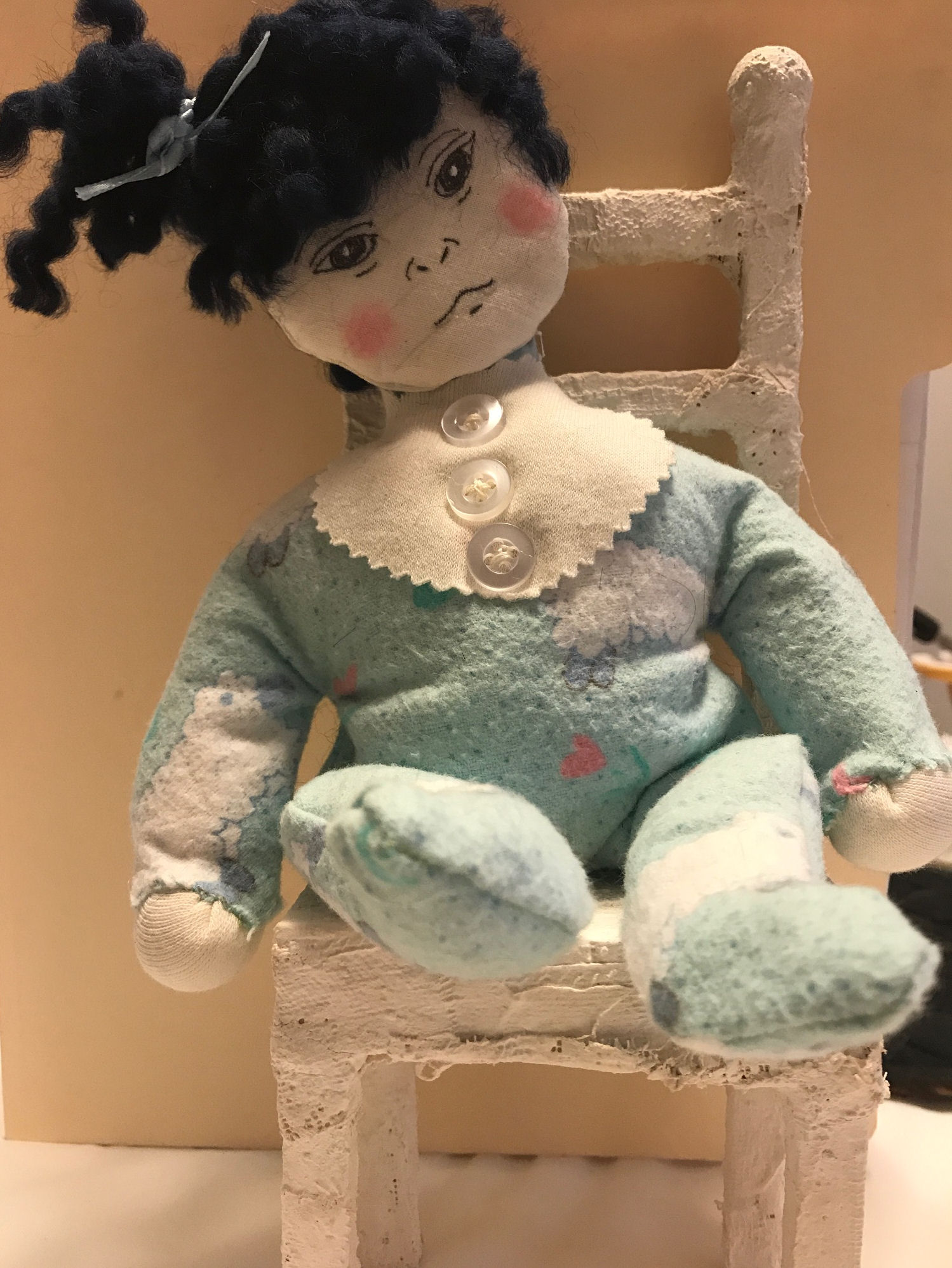 This doll, her clothes, and the chair are made by me without a pattern. Her hair is yarn. Her hands are a knit fabric, and her head is muslin. Mimi's PJ's are fleece. The chair is made out of balsa wood and plaster strips.