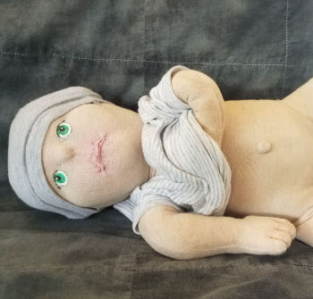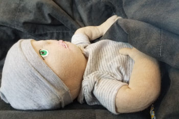 Johny is the second doll I've made with needle sculpted features. I was inspired to make him when my mom tossed out old dolls she had for her daycare. He has 10 fingers, 10 toes, a belly button and a needle sculpted bottom. Johny enjoys spending his days at Grandma's with her daycare kids. He gets lots of attention from her little girls who snuggle and play with him daily. Johny has just started to open his eyes and enjoys laying on his back looking around.